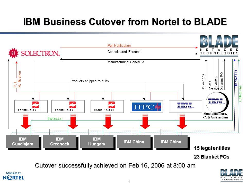 Nortel Networks decided that its ethernet switches for blade servers were not core to its corporate strategy and divested it to Garnett & Helfrich, a private equity company. This spin-out adopted the name ‘Blade Network Technologies’ (‘Blade’). This was an OEM business with a few key customers such as HP and IBM. Supply chain logistics were tightly integrated into the customers and third-party inventory hubs were used across the globe.